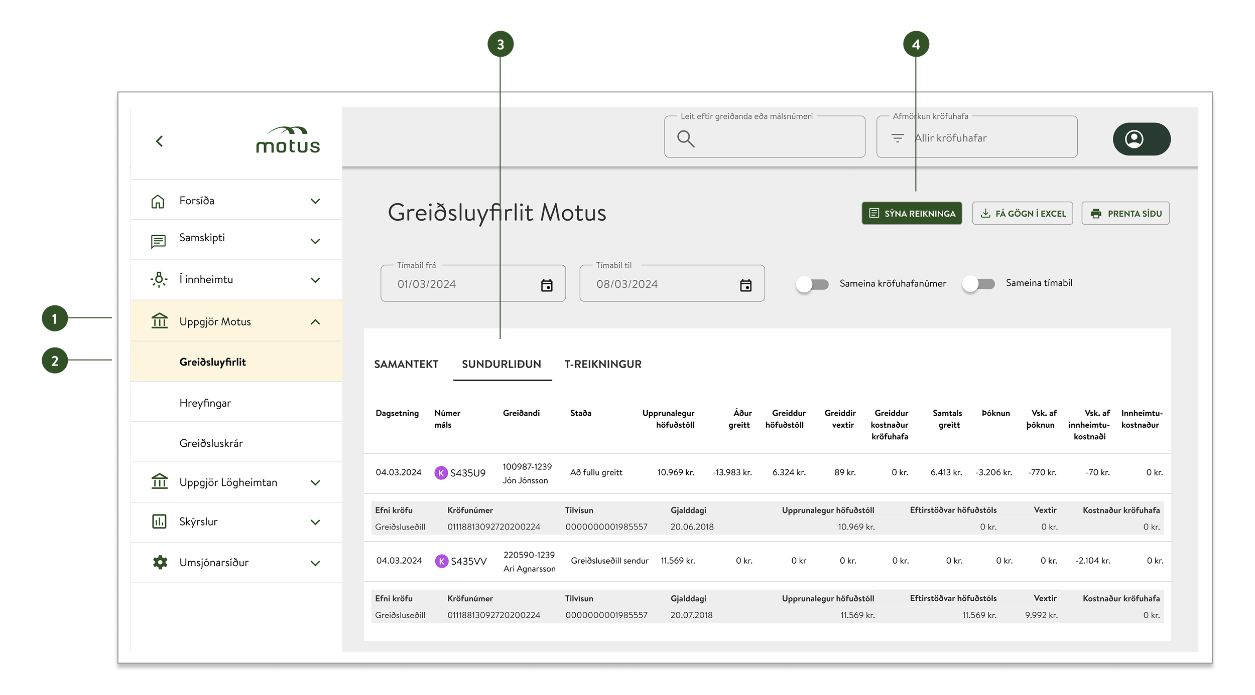 Á viðskiptavefnum er hægt að nálgast samantekt yfir greiðslur ásamt upplýsingum um hvaða málum þær tengjast og hver framkvæmdi greiðsluna. Hægt er að afmarka listann við tiltekið tímabil eða tiltekna dagsetningu, sem og sækja gögnin á Excel-formi.