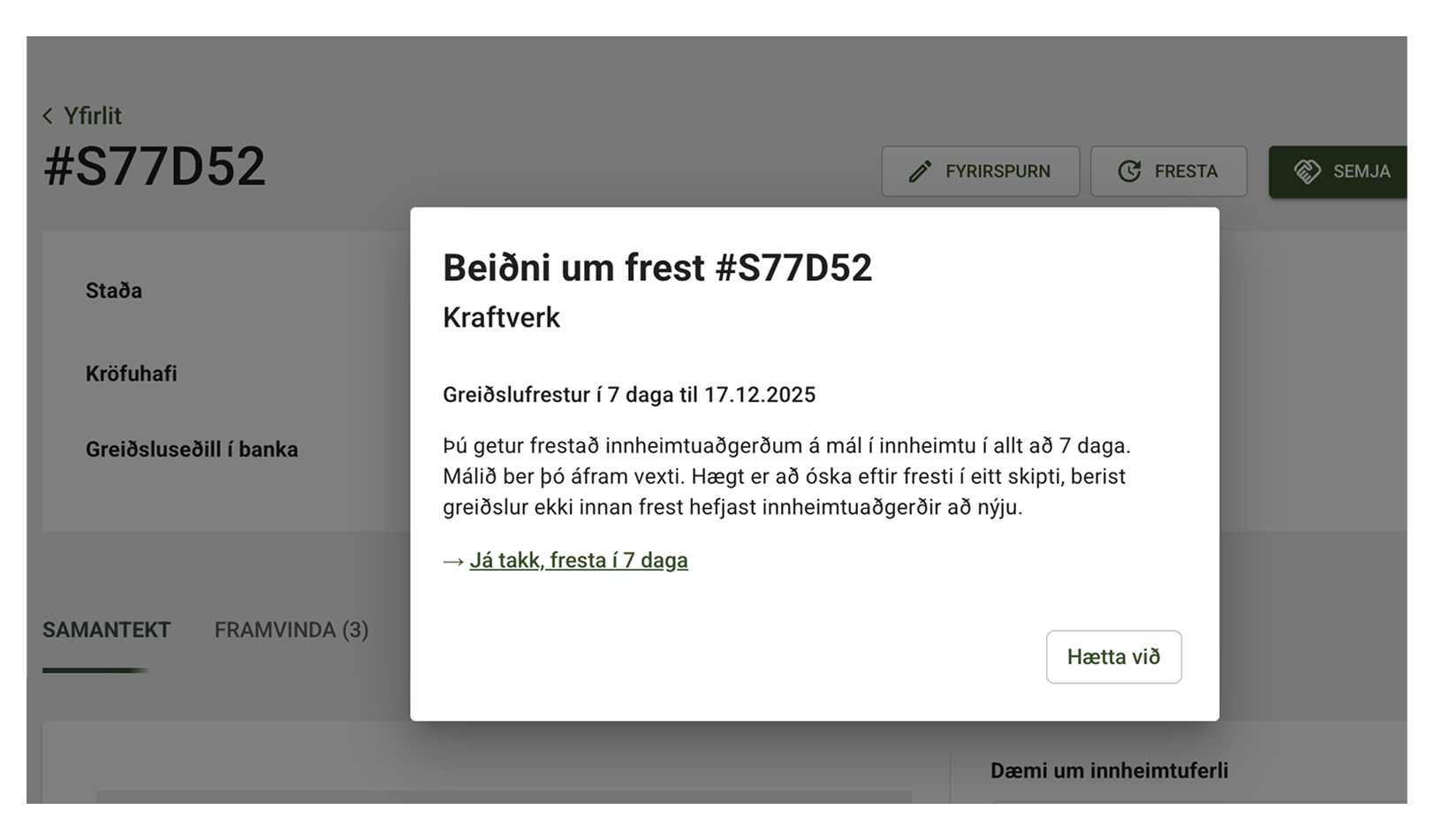 1) Inni á mínum síðum skaltu velja málið sem á að fresta. Efst inni á upplýsingasíðu fyrir málið finnur þú svo aðgerðahnapp til að fresta málinu og þá opnast lítill gluggi til að staðfesta beiðnina.