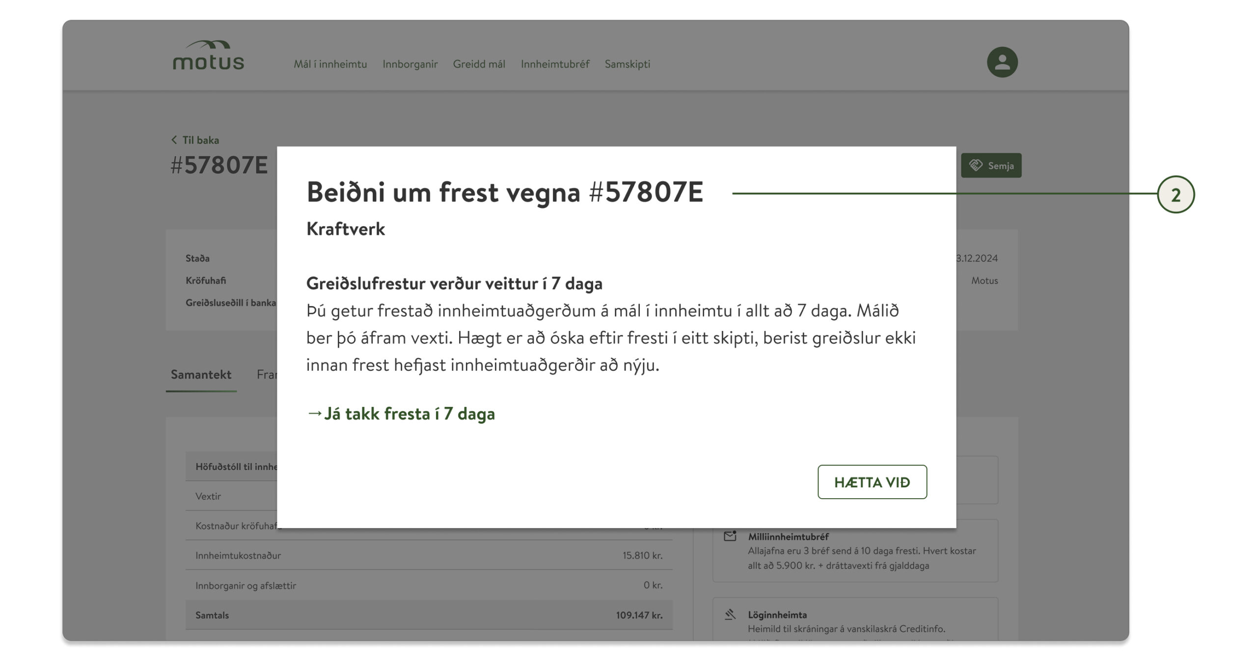 1. Inni á Mínum síðum skaltu velja málið sem á að fresta. Efst á síðunni fyrir málið finnur þú Fresta hnapp.